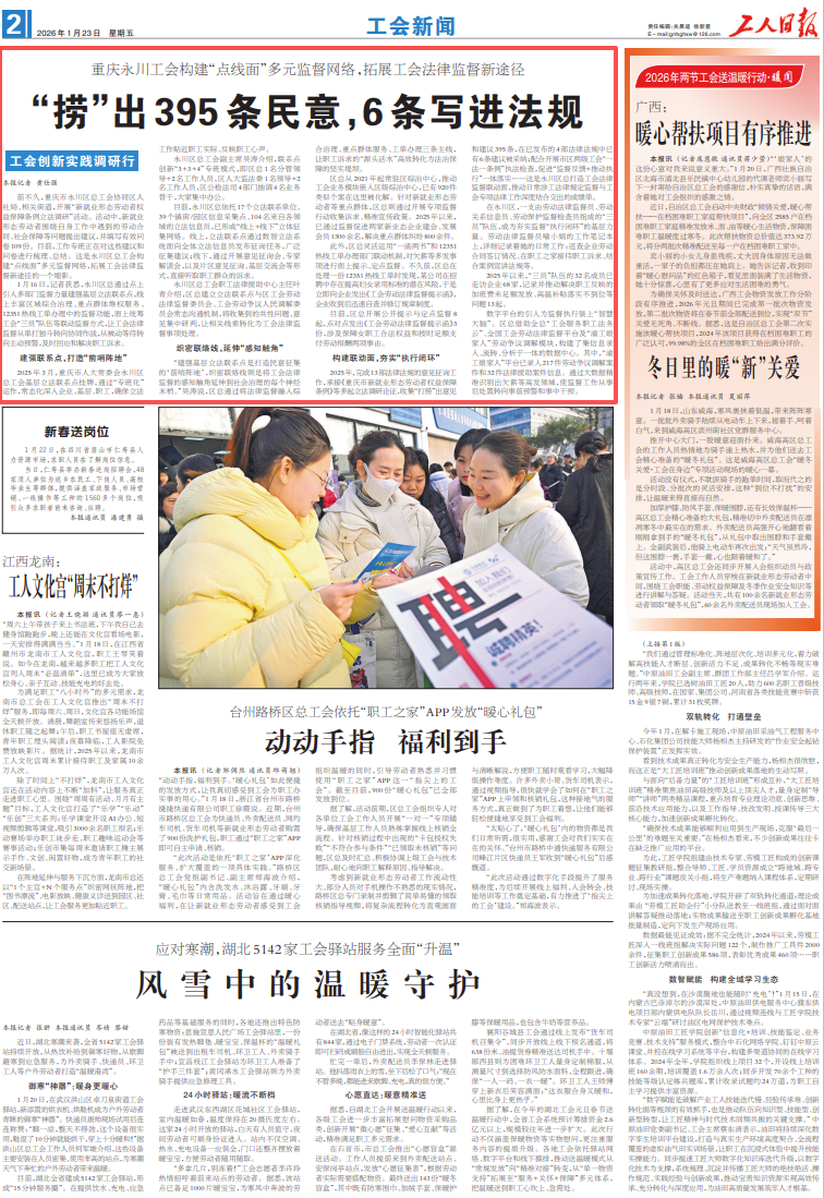 “建强基层立法联系点是打造民意征集的‘前哨阵地’,织密联络线则是将工会法律监督的感知触角延伸到社会治理的每个神经末梢。”吴涛说,区总通过将法律监督融入综合治理、重点群体服务、工单办理三条主线,让职工诉求的“源头活水”高效转化为法治保障的坚实堤坝。