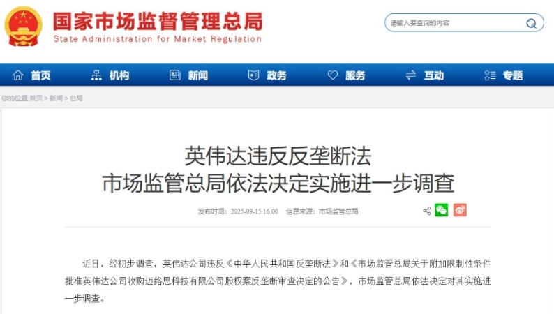英伟达违反反垄断法 市场监管总局依法决定实施进一步调查