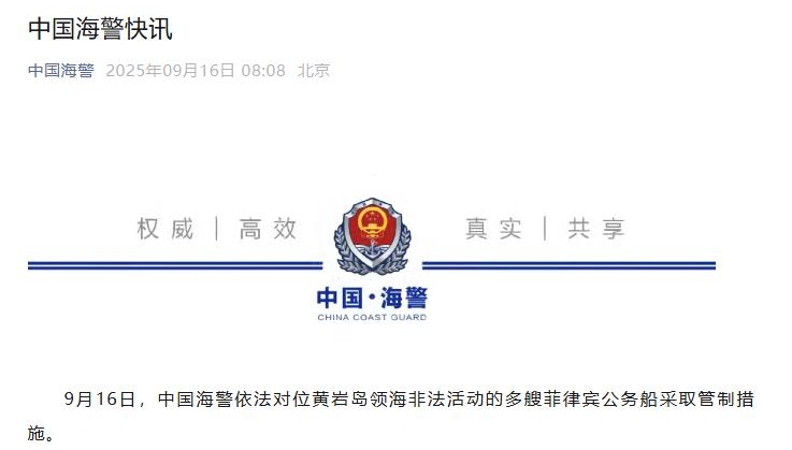 中国海警依法对位黄岩岛领海非法活动的多艘菲律宾公务船采取管制措施