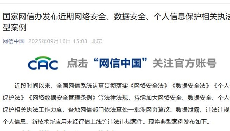 国家网信办发布近期网络安全、数据安全、个人信息保护相关执法典型案例