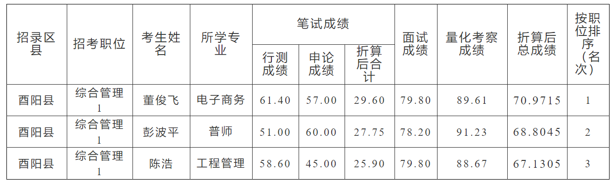 酉阳自治县2024年从优秀村(社区)干部中考试录用公务员笔试、面试和总成绩公布表