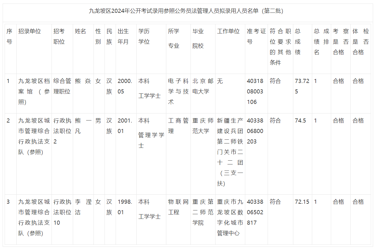 九龙坡区2024年度公开考试录用参照公务员法管理人员拟录用人员公示(第二批)