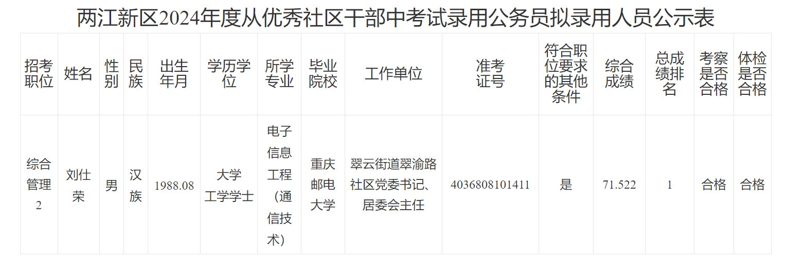 两江新区2024年度从优秀社区干部中考试录用公务员拟录用人员公示