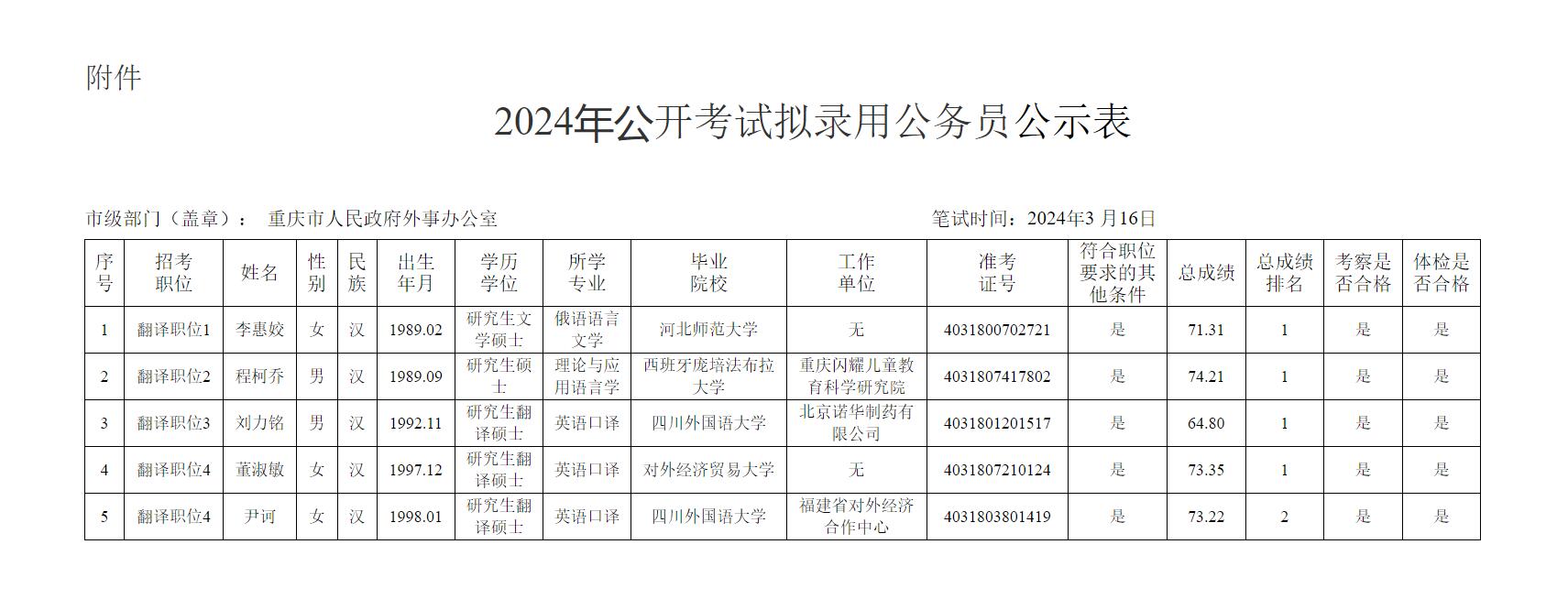 重庆市2024年公开招录法院系统工作人员拟录用人员公示公告
