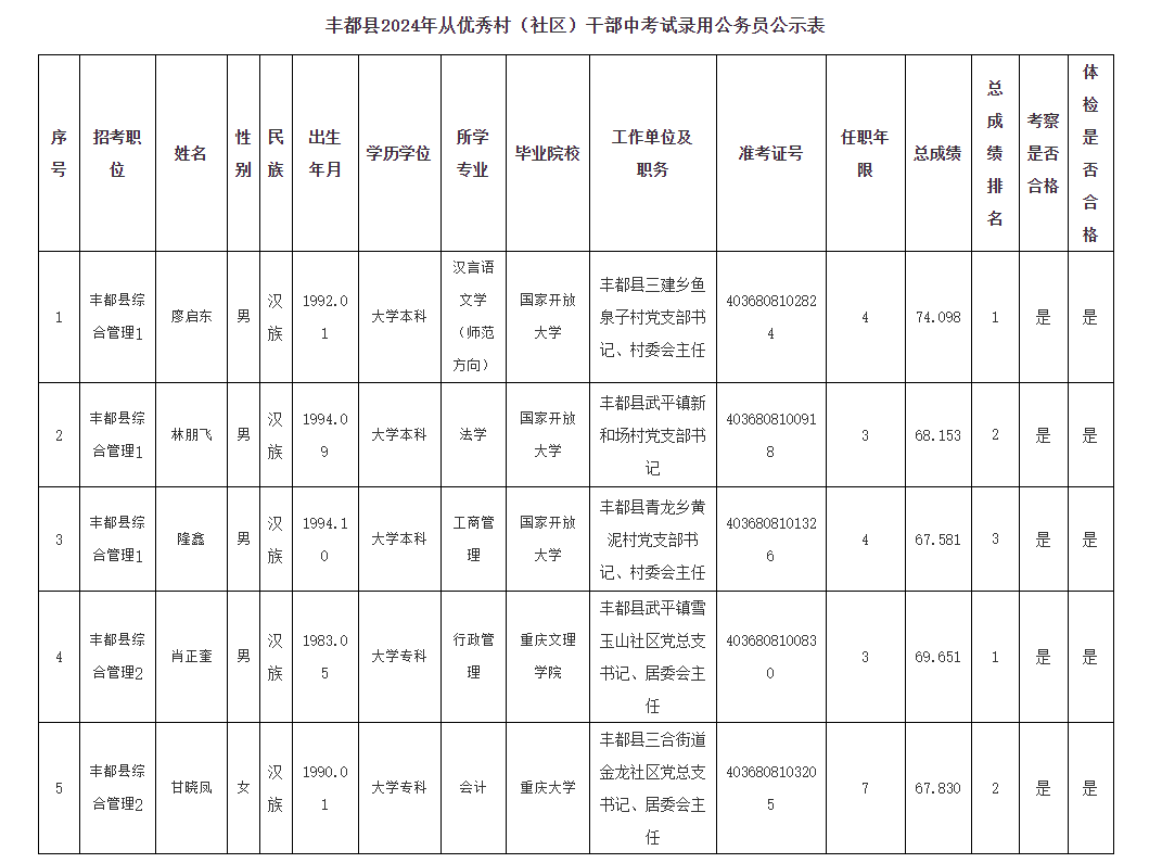 重庆丰都县2024年从优秀村(社区)干部招录公务员拟录用人员公示