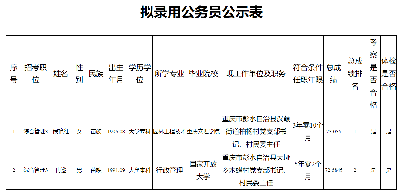 彭水自治县2024年从优秀村(社区)干部招录公务员拟录用人员公示