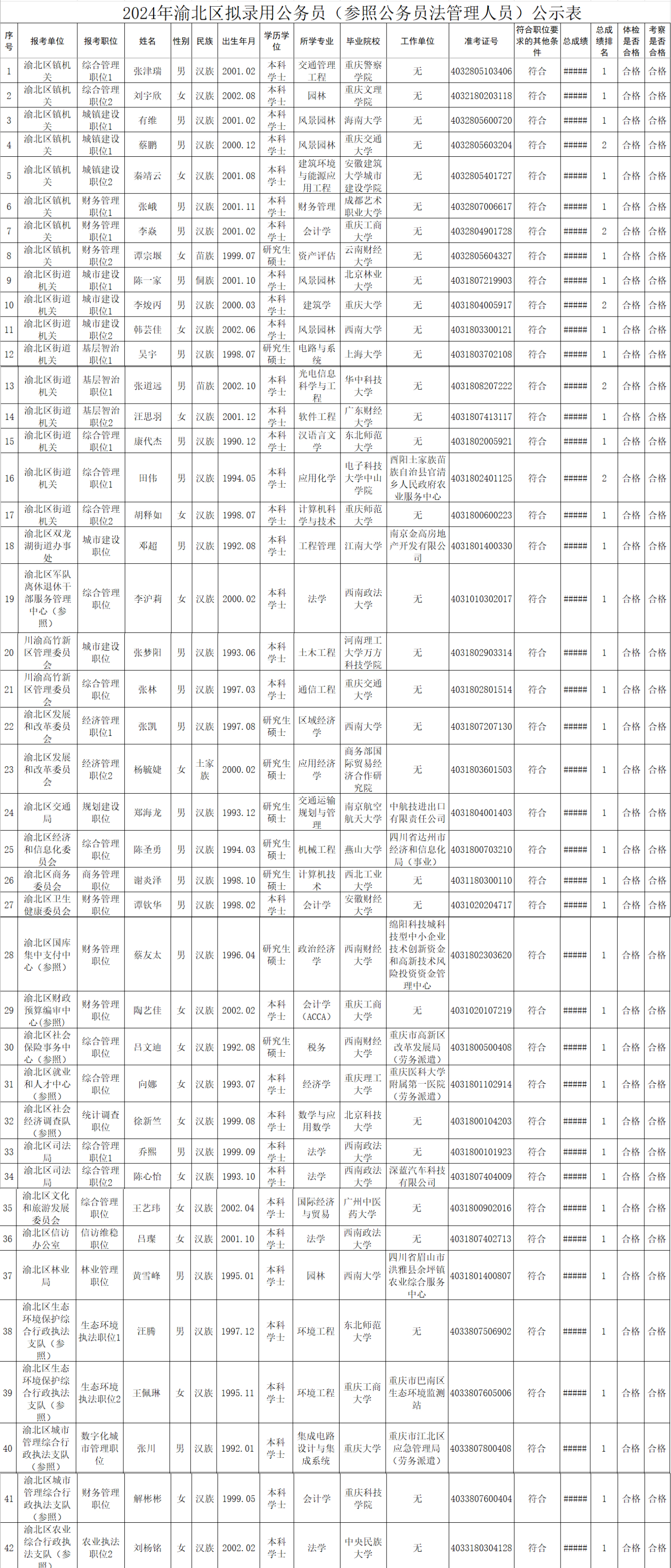 重庆渝北区2024年度公开考试录用公务员拟录用公务员(参照公务员法管理人员)公示