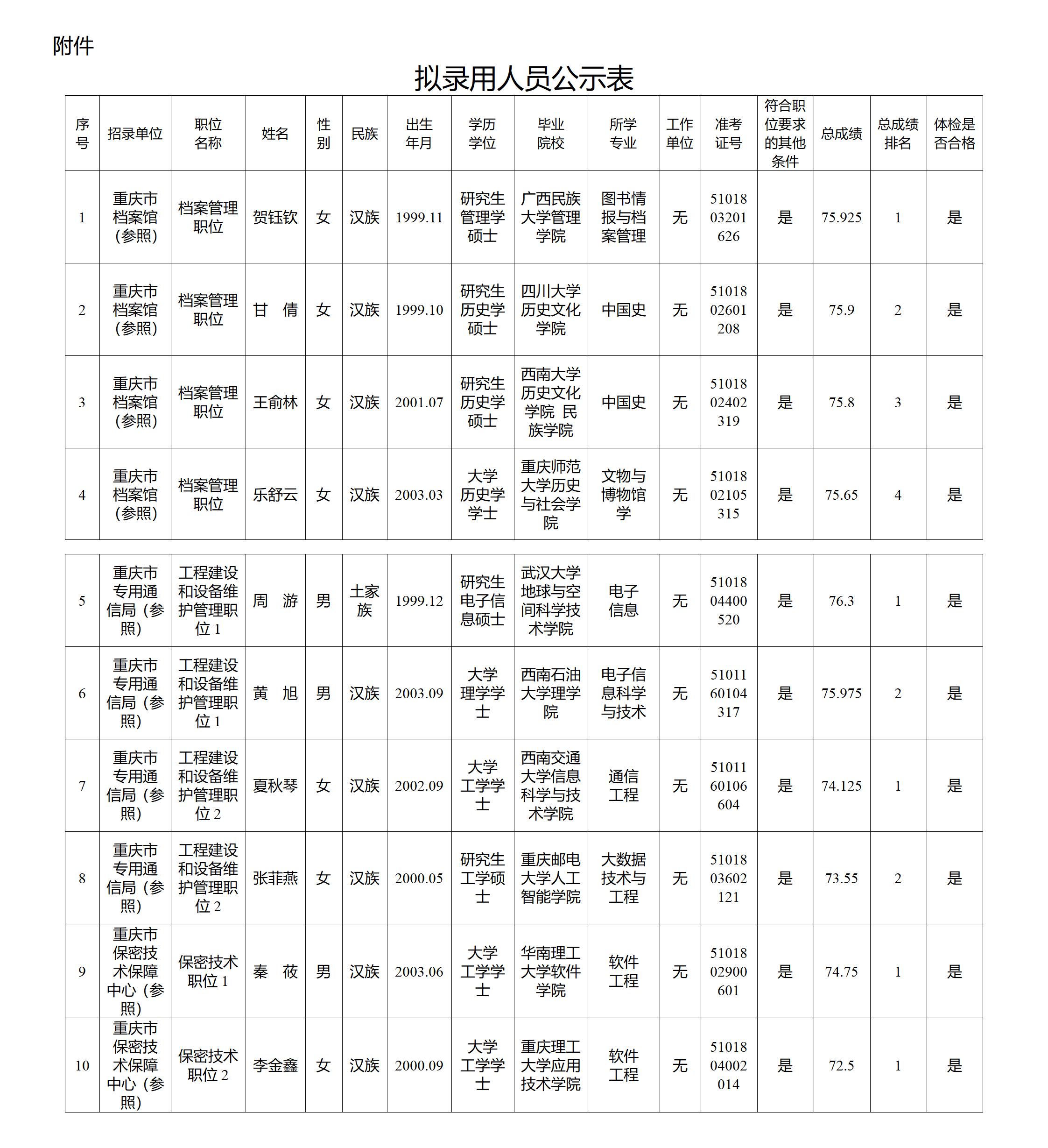 重庆市司法局2025年度公开考试录用公务员拟录用人员公示(第二批)