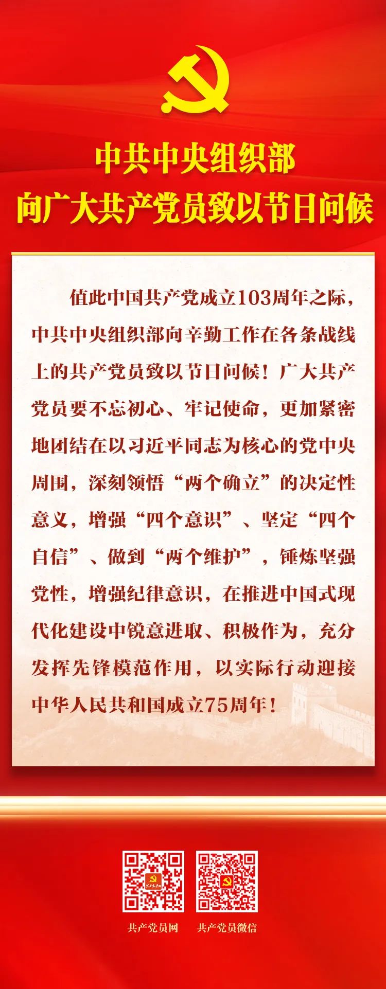 中共中央组织部向广大共产党员致以节日问候