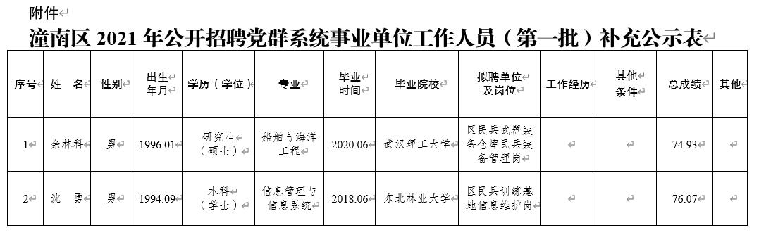 中共重庆市潼南区委组织部关于潼南区2021年公开招聘党群系统事业单位工作人员拟聘人员(第一批)情况的补充公示