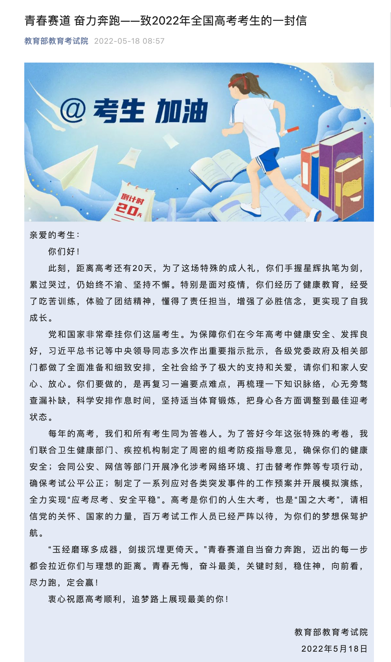 教育部教育考试院发布致2022年全国高考考生的一封信
