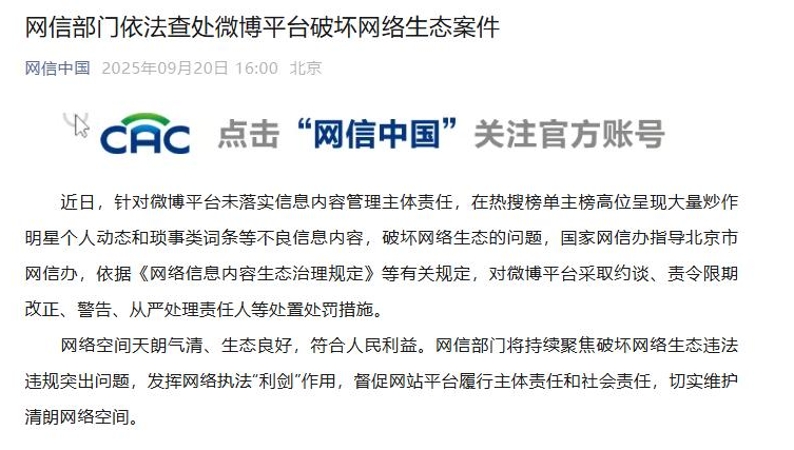 网信部门依法查处微博平台破坏网络生态案件