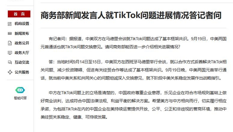 商务部新闻发言人就TikTok问题进展情况答记者问