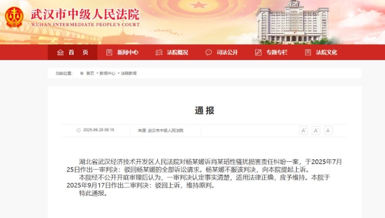 武汉中院二审判决:驳回杨某媛上诉,维持原判